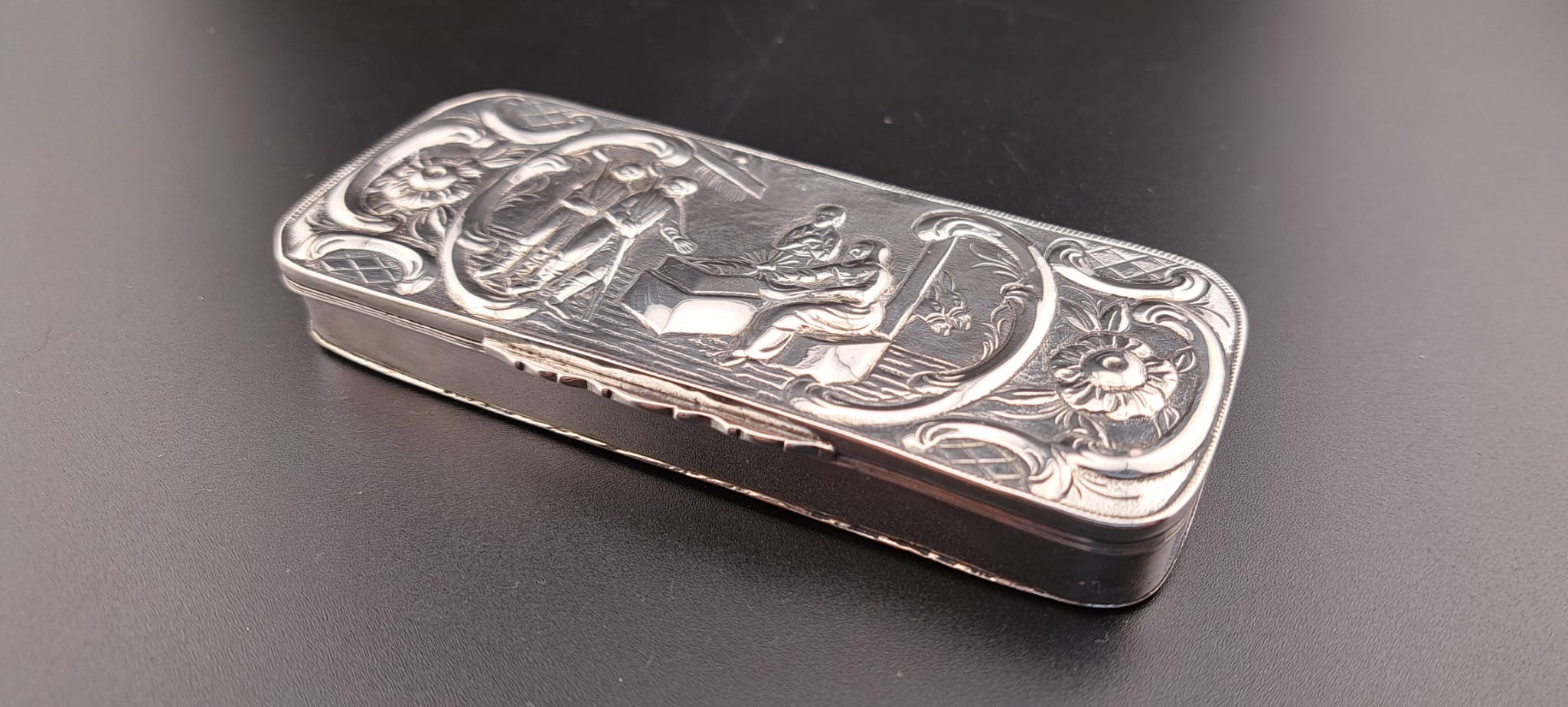 Zo af en toe lukt het De Groninger Zilverkamer om weer een interessant zilveren object te bemachtigen. Begin december was het raak. Er werd een zilveren tabaksdoosje aangeboden. Een doosje dat rond 1770 gemaakt is door de zilversmid Jacobus Reinder Frima in Appingedam. Het bescheiden doosje is in formaat en uitvoering typisch Gronings. Het meet 120 x 50 x 15 mm. De versieringen zijn Bijbelse taferelen, op de bovenzijde de geboorte van Jezus en op de onderzijde de Hemelvaart. De taferelen omgeven door C-voluten, zijn in gedreven techniek uitgevoerd met gegraveerde details. Het geheel is redelijk sober maar technisch goed uitgevoerd. Hier stonden de Groninger zilversmeden in de 18e eeuw om bekend. Zo’n tabaksdoosje geeft ook op andere vlakken informatie. Bijvoorbeeld over het tabaksgebruik. Vanaf ca. 1600 wordt er tabak geconsumeerd in Nederland. In het begin was het echt een luxe product waar zelfs geneeskrachtige werkingen aan toe werden geschreven. In de loop van de tijd werd het voor iedereen haalbaar en was het maatschappelijk normaal om tabak te roken. Sinds een aantal decennia is er, door voortschrijdend inzicht, een ontmoedigingsbeleid vanuit de overheid waardoor het tabaksgebruik afneemt. Dat tabak in de 17e en 18e eeuw een luxe product was zien we terug in het diverse aanbod zilveren tabaksverwante gebruiksartikelen, waaronder de diverse artikelen om tabak in de bewaren en mee te nemen. In de 17e eeuw werd tabak voornamelijk in pijpen gestopt, gesnoven en gepruimd. In deze tijd zien we tabakspotten. Toen er in de 18e eeuw zakken in kleding kwamen zag je meer en meer kleinere tabaksdozen om tabak mee te kunnen nemen onderweg. Vanaf 1850 wordt tabak steeds meer verwerkt in sigaren en later sigaretten en daarmee veranderden de dozen naar de afmeting van de sigaren en sigaretten. En nu weer terug naar het mooie zilveren tabaksdoosje van Frima. Dat past dus precies in de periode dat tabak meegenomen werd onderweg. Het was een gebruiksvoorwerp maar gaf indirect ook de status van de eigenaar aan. Hij kon zich tabak veroorloven, inclusief een zilveren doos! Zoveel informatie in zo’n kleinood! In De Groninger Zilverkamer zijn al een paar andere items van Jacobus Frima te bezichtigen, waaronder een zilveren brandewijnskom. Het moge duidelijk zijn dat het museum blij is met dit tabaksdoosje als aanvulling op de vaste collectie. Het doosje ooit gemaakt in Appingedam is terug in Appingedam